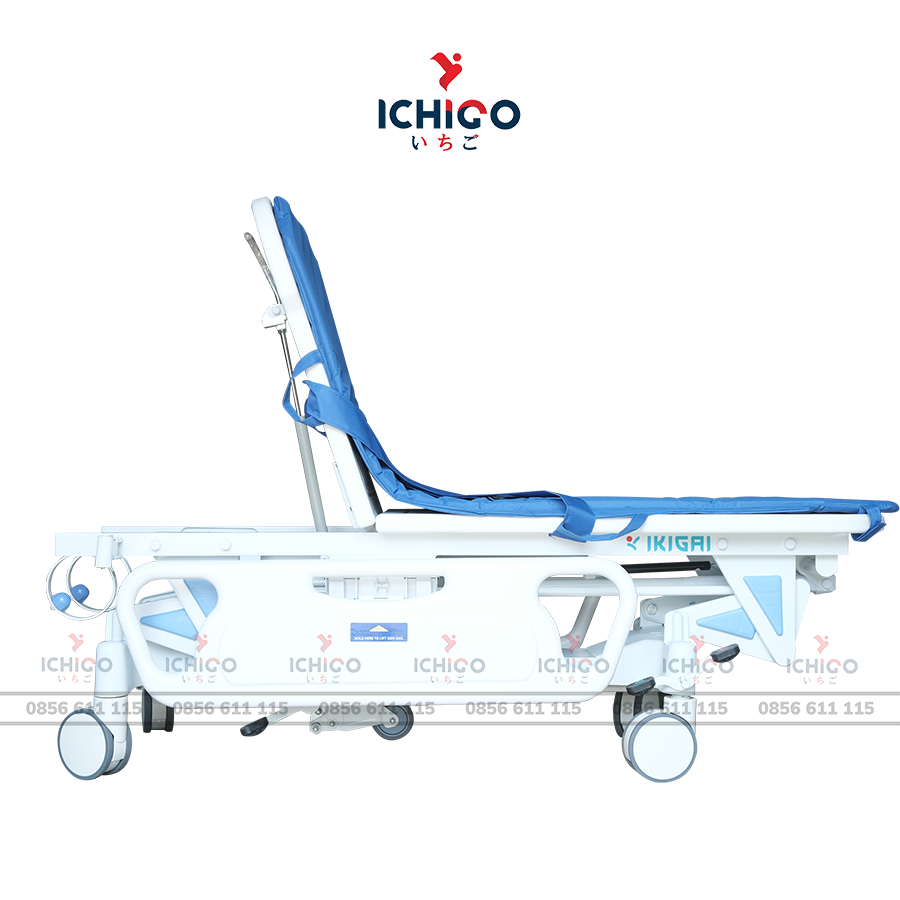 Tựa lưng của băng ca được nâng hạ bằng piston khí, cho thao tác êm ái và nhẹ nhàng. Góc nâng có thể điều chỉnh linh hoạt từ 0° đến ≥75°, giúp dễ dàng thay đổi tư thế phù hợp với tình trạng của từng bệnh nhân, đồng thời hỗ trợ hiệu quả cho quá trình vận chuyển, theo dõi và chăm sóc trong thực tế lâm sàng.